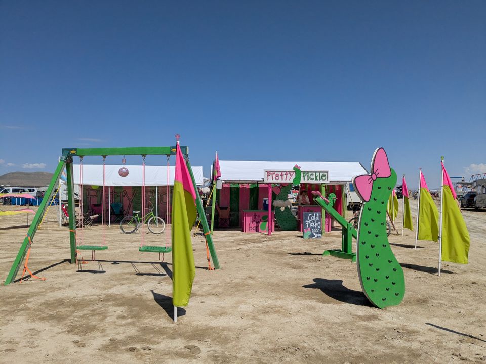 Daily afternoon cold pickle service (12PM-3PM Monday through Saturday). We invite passersby to step under our shade, enjoy a refreshing treat, and ride our disco pickle swing! In-the-know visitors may inquire about our playa-famous pickle warmers! Join Us!